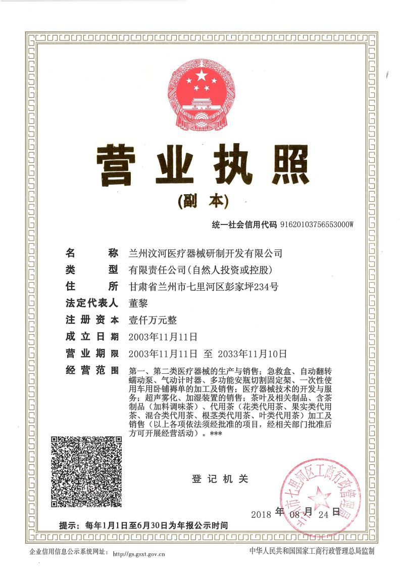 蘭州汶河醫療器械研制開發有限公司成立于2003年11月11日,是一家集醫療器械研制、開發、生產、銷售及服務于一體的科技創新型企業。2010年天津紅日藥業增資我司,擴地建廠,2012年、2015年、2018年相繼被認定為國家高新技術企業,2019年被認定為甘肅省科技型中小企業。目前擁有涉及醫療器械領域的發明專利4項,實用新型專利60余項,日內瓦金獎1項,醫療器械產品注冊證22項;2016年、2018年分別獲甘肅省專利獎各1項,2018年獲甘肅省技術發明獎1項。多個項目獲得國家科技部火炬中心“科技型中小企業技術創新基金”,甘肅省、蘭州市科技項目的立項扶持。2020年獲得蘭州市十大誠信企業,汶河公司創始人董黎先生于2019年獲發明人獎。